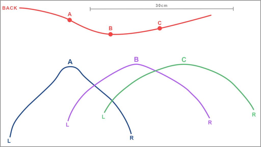 A, B, C – Transverse sections (back shapes)