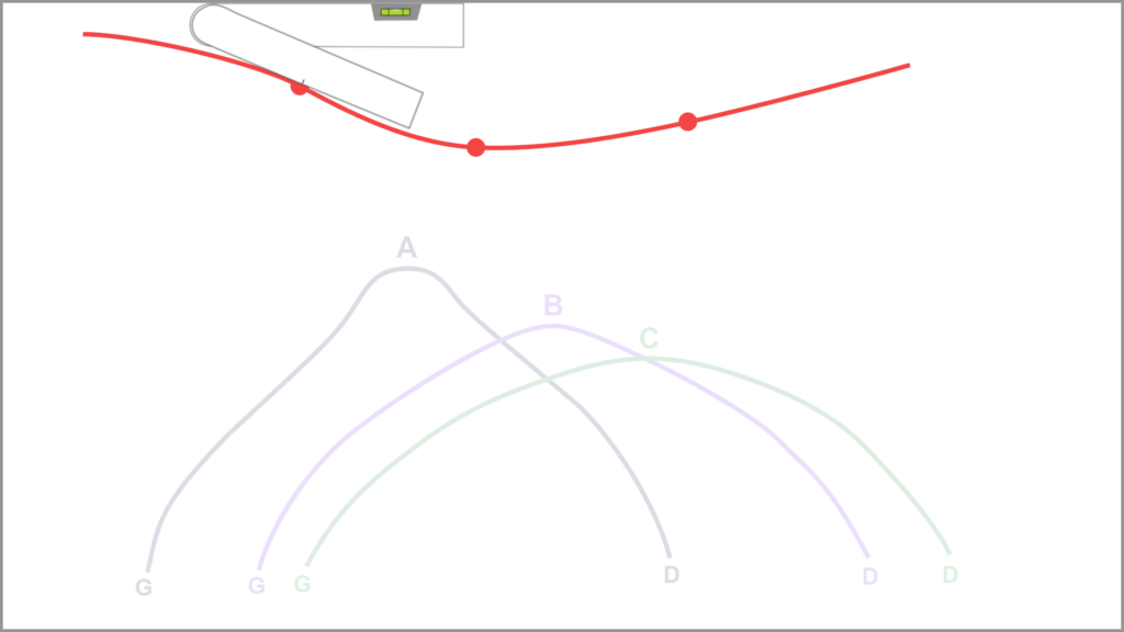 Do not forget to indicate the marked reference points on the BACK curve (location of the adhesive tapes corresponding to A, B and C). Orient the curve using the spirit level on the sheet. Each transverse curve (A, B, C) must be clearly identified, with indication of the left and right sides (L, R).