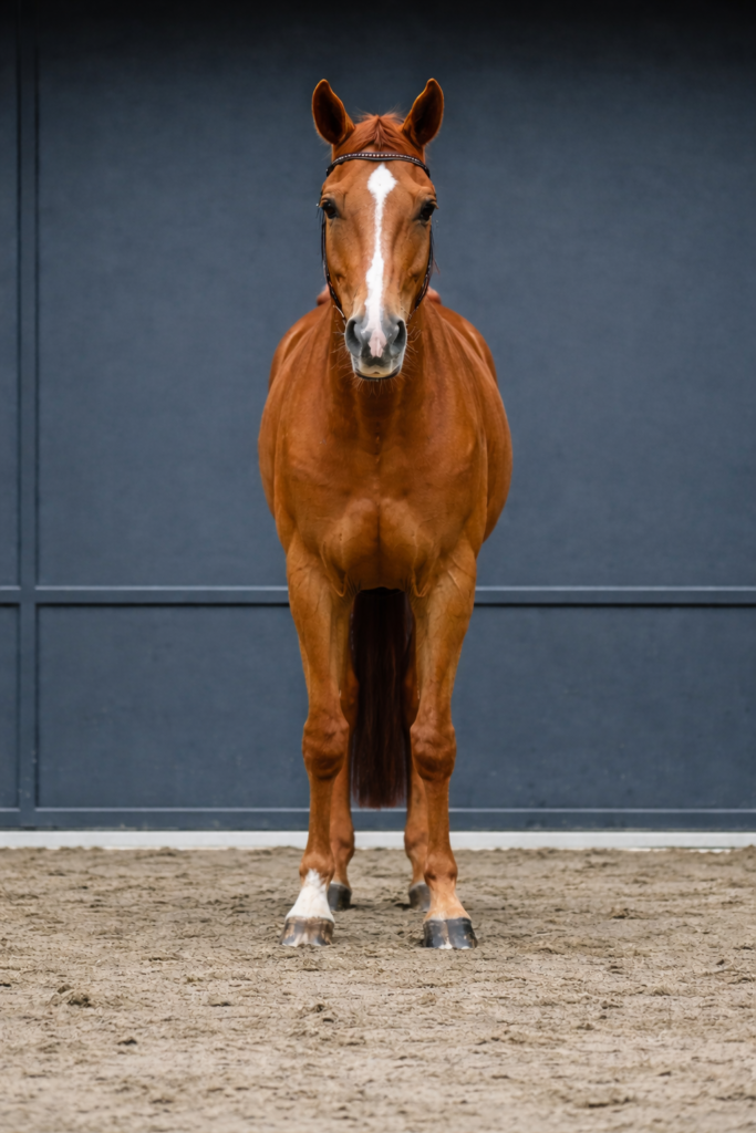 Photographiez le cheval de profil, en position d’aplomb sur un sol plat. Assurez-vous que le cheval soit cadré en entier, de la tête à la queue. Cette vue permet d’apprécier la ligne du dos, la position du garrot et la proportion générale du cheval. Placez-vous à distance moyenne, à hauteur du garrot.