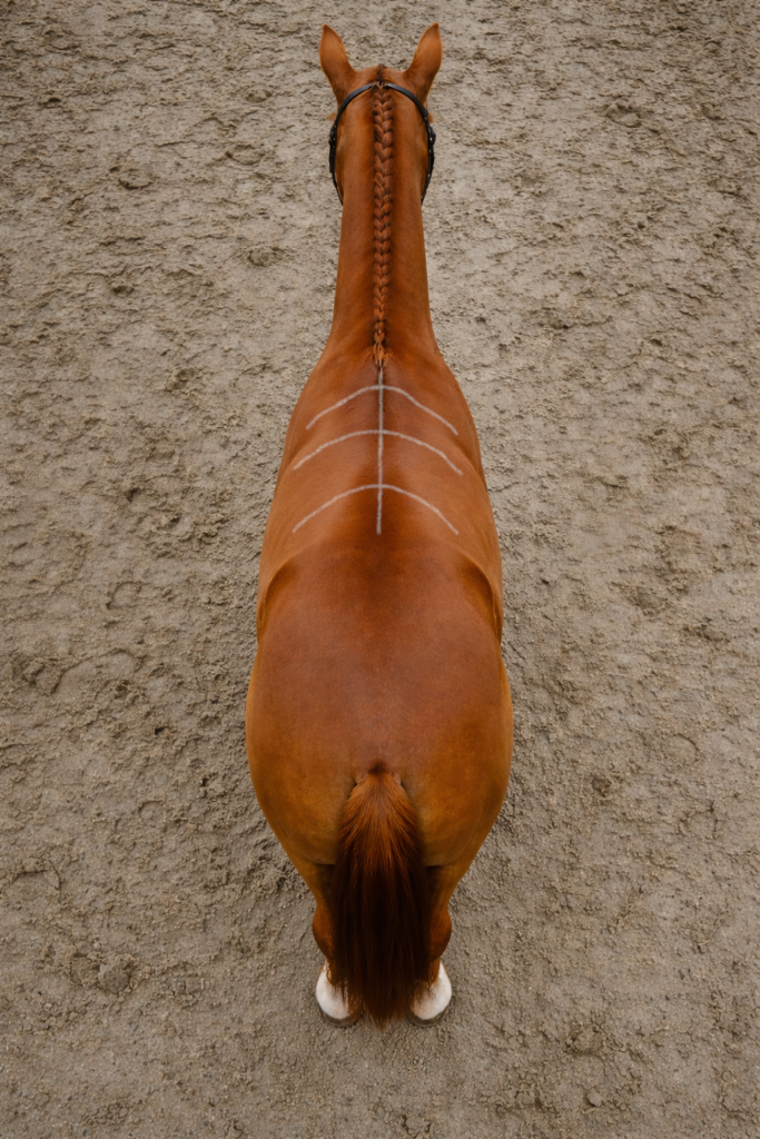 Prenez une photo en vous plaçant au-dessus du dos à l’arrière du cheval, capturant la zone allant de la croupe au garrot. Cette perspective révèle la forme générale du dos, sa symétrie et la répartition musculaire. Pour cette prise de vue, utilisez si nécessaire un escabeau stable.